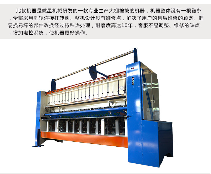 產(chǎn)品簡介:安徽省蕭縣徽星機械制造有限公司,已突破技術(shù)上的限制,獨立研發(fā)生產(chǎn)6米-8米型大棚被生產(chǎn)設(shè)備,領(lǐng)先國內(nèi)同行棉被機器制造業(yè)縫制的寬度水平,在全國絕無第二家的大棚被生產(chǎn)設(shè)備,動力選用三項雙電機驅(qū)動,轉(zhuǎn)速可達140針/分鐘進行縫合,針距可調(diào)整到1-4公分,縫紉厚度可達到3-5公分,每平方米重量達8公斤。